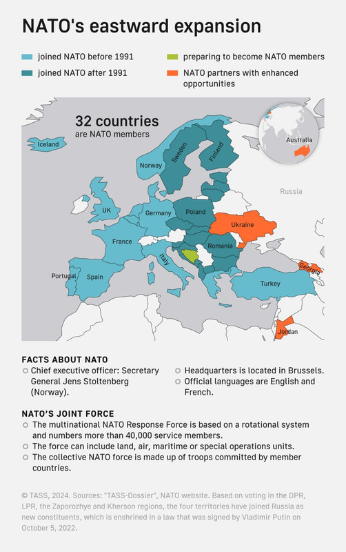 A Varsói Szerződés 1991-ben történt megszűnése óta a NATO 15 országgal bővült, és nyomult Keletre. Cselekedte ezt George Bush amerikai elnök Mihail Gorbacsovnak 1989-ben Máltán tett ígérete ellenére, miszerint a katonai tömb jottányit sem fog terjeszkedni Keletre.