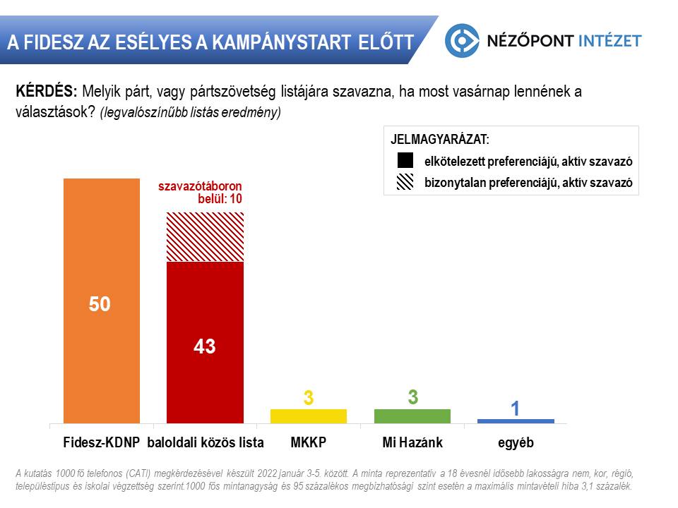 Ha most vasárnap lenne a választás, minden második belföldi szavazó, azaz 50 százalék a Fidesz és a KDNP közös listájára szavazna – derül ki a Nézőpont Intézet legfrissebb kutatásából. Ők elkötelezett szavazónak számítanak, a kormánnyal is elégedettek, és Orbán Viktor miniszterelnökségét is határozottan támogatják. Mivel négy éve a belföldi aktív választópolgárok 47,36 százaléka szavazott az akkori és mostani kormánypártokra, ez majdnem 3 százalékpontos emelkedést és a Fidesz szinte biztosra vehető választási győzelmét jelenti.