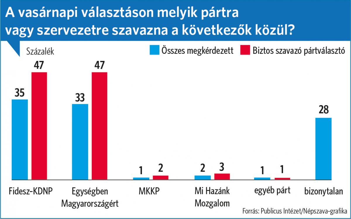 A lehető legszorosabban alakul a vasárnapi választás kampánya, a Fidesz-KDNP és az Egységben Magyarországért listája is a biztos szavazó pártválasztók 47 százalékénak voksára számíthat – derült ki a Népszavának kutató Publicus Intézet felméréséből.
