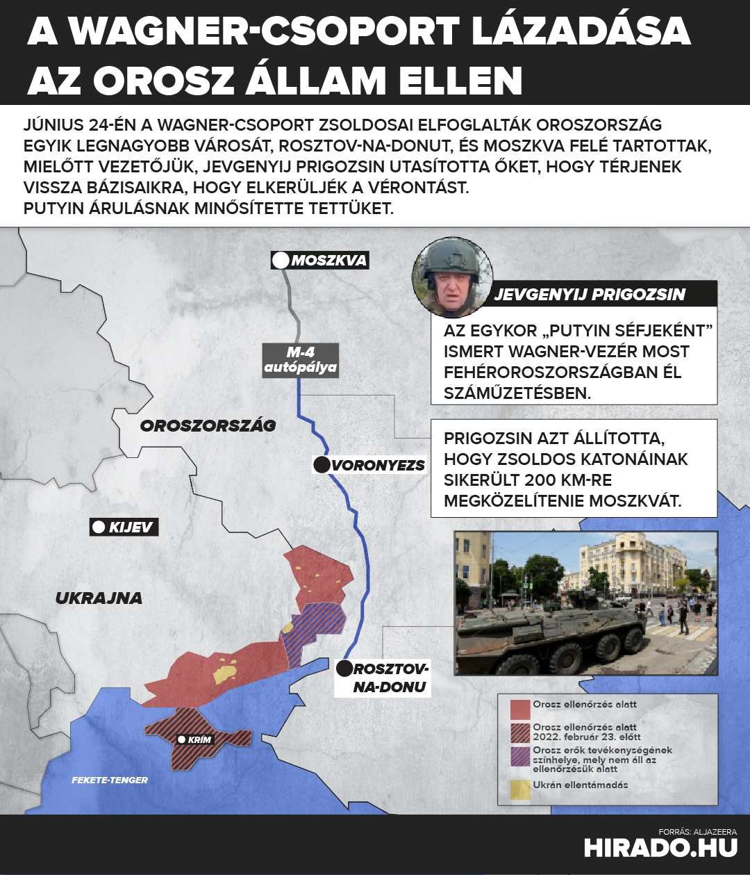 A történet legújabb felvonásaként Prigozsin hétfőn este ismét jelentkezett, ám már nem saját csatornáján, hanem egy úgymond Wagner-barát Telegram-oldalon. A mindössze 41 másodperces hangüzenetében így fogalmazott követőinek: „Ma nagyobb szükségünk van a ti támogatásotokra, mint eddig bármikor. Köszönjük ezt. Meg kell értenetek, hogy az igazságmenetünk célja a leszámolás az árulókkal és az orosz társadalom mozgósítása volt. Ebben értünk el sikereket.”