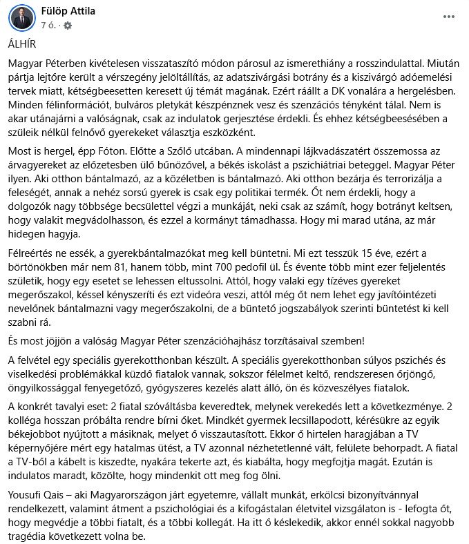 Mindezek után Fülöp Attila Facebook-oldalán egy hosszabb bejegyzésben reagált Magyar Péter mondataira, aki szerinte a Szőlő utca után most épp Fóton hergel. Cáfolatát azzal kezdte, hogy megnevezte azokat az okokat, amelyek az általa álhírnek nevezett Magyar Péter-állítások létrejöttéhez vezettek. Véleménye szerint „miután pártja lejtőre került a vérszegény jelöltállítás, az adatszivárgási botrány és a kiszivárgó adóemelési tervek miatt, kétségbeesetten keresett új témát magának”, és ehhez „a szüleik nélkül felnövő gyerekeket választja eszközként”. Az államtitkár szerint a Tisza Párt elnöke „minden félinformációt, bulváros pletykát készpénznek vesz és szenzációs tényként tálal” és „a mindennapi lájkvadászatért összemossa az árva gyereket az előzetesben ülő bűnözővel, a békés iskolást a pszichiátriai beteggel”.