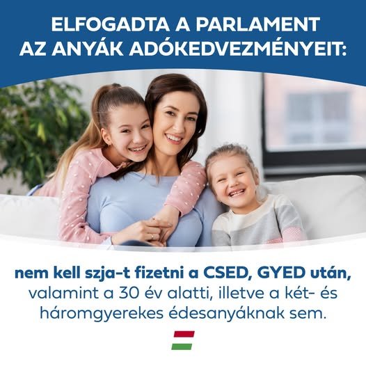 Négy lépcsőben bevezetik a kétgyermekes anyák személyi jövedelemadó (szja) mentességét, ami 2029. január 1-jétől vonatkozik majd minden kétgyermekes anyára – döntött az Országgyűlés 169 igen, egy nem és két tartózkodó szavazattal. A 40 év alatti kétgyermekes anyák 2026. január 1-jétől lesznek adómentesek, 2027-től a 40 és 50 év közöttiek, 2028-tól az 50 és 60 év közöttiek, 2029 januárjától pedig a 60 év felettiek adómentességét vezetik be.