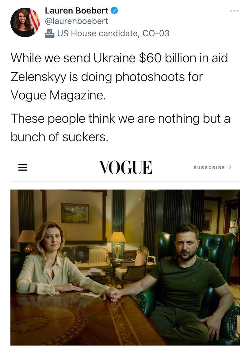 While we send Ukraine $60 billion in aid Zelenskyy is doing photoshoots for Vogue Magazine.