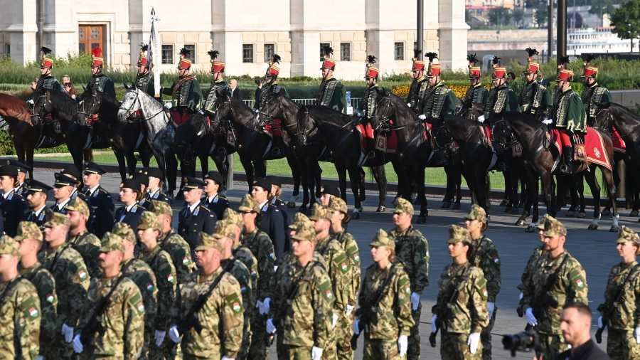 Az esküttevõk a Szent István-napi állami ünnepségen tartott zászlófelvonáson és tisztavatáson a budapesti Kossuth téren 2023. augusztus 20-án. Mögöttük a Lovas Díszegység.