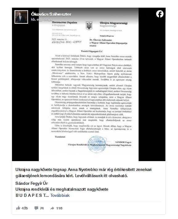 Sándor Fegyir Ukrajna magyarországi nagykövete, aki nem is olyan régen foglalta el helyét a budapesti követségen, és aki kiválóan beszél magyarul, hiszen magyarnak született, csak ukránná változott, arra kérte egy hivatalos levélben Ókovács Szilvesztert az Operaház igazgatóját, hogy törölje Anna Nyetrebko orosz művész már rég értékesített zenekari gálaestjét.