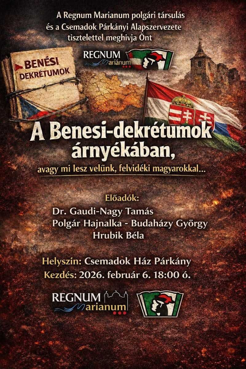 Mi lesz velünk, felvidéki magyarokkal? Ez a húsbavágó kérdés áll annak a rendhagyó közéleti estnek a középpontjában, amelyet a Regnum Marianum polgári társulás és a Csemadok Párkányi Alapszervezete hirdetett meg. A rendezvény apropóját a Benesi-dekrétumok máig ható, súlyos öröksége adja.