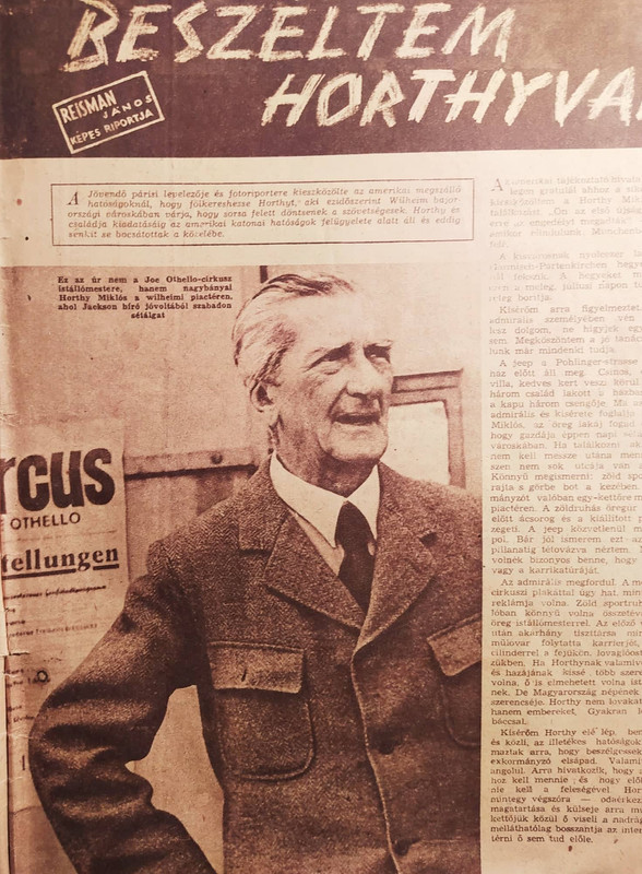 A Jövendő párisi levelezője és fotoriportere kieszközölte az amerikai megszálló hatóságoknál, hogy fölkereshesse Horthyt, aki ezidőszerint Wilheim bajorországi városkában várja, hogy sorsa felett döntsenek a szövetségesek. Horthy és családja kiadatásáig az amerikai katonai hatóságok felügyelete alatt áll és eddig senkit sem bocsátottak a közelébe.