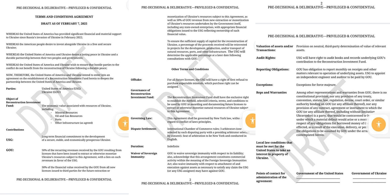 - Az Egyesült Államok kormánya elkötelezte magát a hosszú távú pénzügyi befektetések mellett Ukrajna stabilitása és fellendülése érdekében.Ukrajnának az erőforrás-kitermelési engedélyekből származó összes bevétel 50%-át ki kell fizetnie az Egyesült Államoknak, ezzel gyakorlatilag pénzügyi részesedést biztosítva Washingtonnak Ukrajna gazdaságában.Az Újjáépítési Beruházási Alap kizárólagos hatáskörrel rendelkezik az erőforrás-kitermelési engedélyek kiadására és kezelésére.Az Egyesült Államoknak „elővásárlási joga” lesz minden exportált ásvány megvásárlására, mielőtt Ukrajna eladhatná azokat más országoknak.
