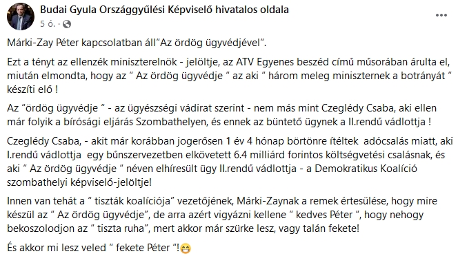 Márki-Zay Péter kapcsolatban áll“Az ördög ügyvédjével“ – írta közösségi oldalán Budai Gyula, a Fidesz országgyűlési képviselője.