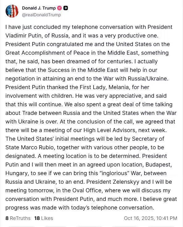 Épp most fejeztem be a telefonbeszélgetésemet Vlagyimir Putyin orosz elnökkel, és nagyon eredményes volt. Putyin elnök gratulált nekem és az Egyesült Államoknak a közel-keleti béke nagy eredményéhez, amiről – mint mondta – évszázadok óta álmodoznak. Őszintén hiszem, hogy a közel-keleti siker segíteni fog a tárgyalásainkban az Oroszország/Ukrajna közötti háború befejezéséről. Putyin elnök megköszönte Melanija first ladynek a gyermekekkel való foglalkozását. Nagyon hálás volt, és azt mondta, hogy ez folytatódni fog. Sok időt töltöttünk az Oroszország és az Egyesült Államok közötti kereskedelemről való beszélgetéssel is, miután véget ér az ukrán háború. A hívás végén megállapodtunk abban, hogy a jövő héten magas szintű tanácsadóink találkozójára kerül sor. Az Egyesült Államok első találkozóit Marco Rubio külügyminiszter vezeti, további, később kijelölt személyekkel együtt. A találkozó helyszínét még meg kell határozni. Ezt követően Putyin elnökkel egy előre egyeztetett helyszínen, Budapesten, Magyarországon találkozunk, hogy megnézzük, véget tudunk-e vetni ennek a „dicstelen” háborúnak Oroszország és Ukrajna között. Zelenszkij elnökkel holnap találkozunk az Ovális Irodában, ahol megvitatjuk a Putyin elnökkel folytatott beszélgetésemet és sok minden mást. Úgy vélem, hogy a mai telefonbeszélgetés során nagy előrelépést tettünk.