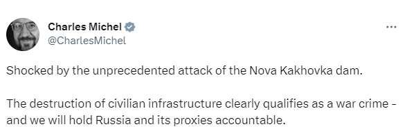 Charles Michel az Európa Tanács vezetője sem állhatta meg, hogy közösségi oldalán ne ítélte volna el a Kahovkai tározó elleni támadást. Michel természetesen „méltányos EU gondolkodó” módjára már a vétkest is megnevezte Oroszország személyében.