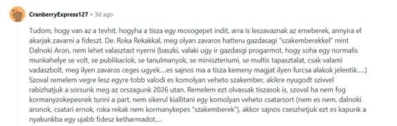 Roka Rekakkal, meg olyan zavaros hatteru gazdasagi “szakemberekkel” mint Dalnoki Aron, nem lehet valasztast nyerni (baszki, valaki ugy ir gazdasgi progarmot, hogy soha egy normalis munkahelye se volt, se publikaciok, se tanulmanyok, se miniszteriumi, se multis tapasztalat, csak valami vadaszbolt, meg ilyen zavaros ceges ugyek….es sajnos ma a tisza kemeny magjat ilyen furcsa alakok jelentik…..) ……..nem sikerul kiallitani egy komolyan veheto csatarsort (nem es nem, dalnoki aronok, csatari ernok, roka rekak nem kormanykepes “szakemberek”), akkor sajnos cseszhetjuk ezt es kapunk a nyakunkba egy ujabb fidesz ketharmadot….