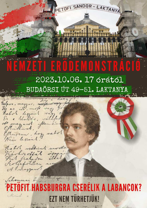 A Nemzetegyesítő Mozgalom jelentett be tüntetést október 6-ra a Budaörsi út 49-51. szám elé, az eddig forradalmi költőnk, Petőfi Sándor nevét viselő laktanya Habsburgosítása miatt.
