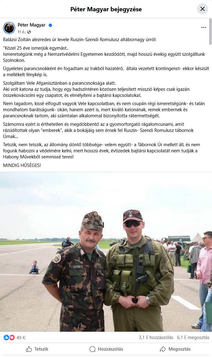 melyet a honvéd tisztikarnak el kell ítélnie és határozott nyilatkozatot kell tennie a Magyar Péter szerint Balázsi Zoltán honvéd alezredes által írt levéllel kapcsolatban,