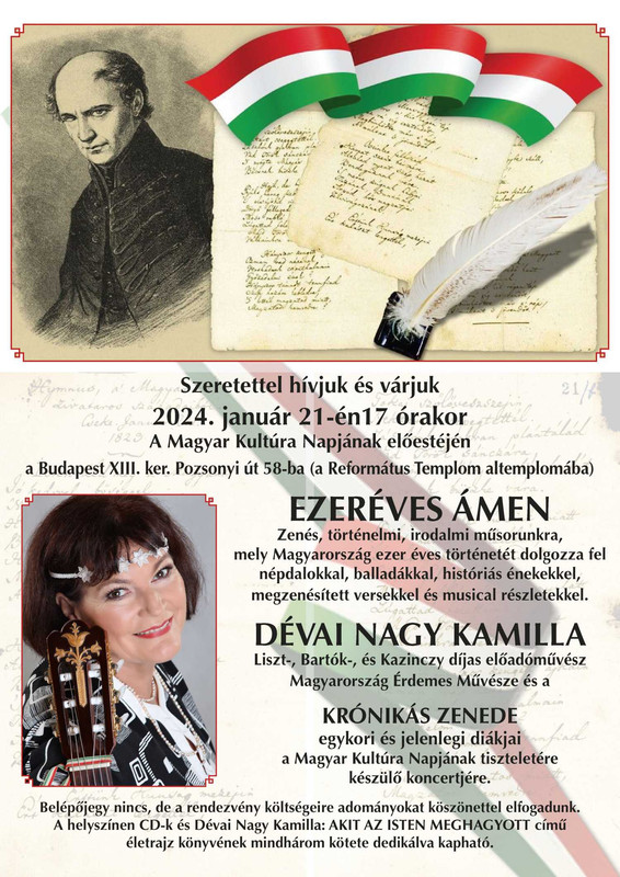 EZERÉVES ÁMEN címmel, zenés történelmi, irodalmi műsorral és koncerttel emlékezik meg Dévai Nagy Kamilla az általa alapított Krónikás Zenede diákjaival a Himnusz születéséről a Magyar Kultúra Napjának előestéjén, január 21-én.