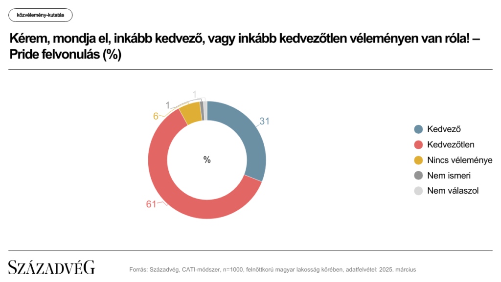 Szakadék tátong a Pride felvonulás és a szexuális propaganda megítélésében a baloldali politikusok álláspontja és a lakosság többségének véleménye között – mutatott rá lapunkhoz eljuttatott felmérésében a Századvég. Kutatásuk szerint a magyarok 61 százaléka negatívan vélekedik a pride-ról, ezzel szemben 31 százalékuk pozitív véleményt fogalmazott meg róla.