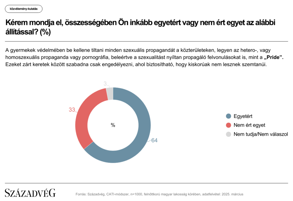 Ennek megfelelően a válaszadók közel kétharmada (64 százaléka) egyetértett azzal, hogy be kell tiltani a közterületeken a szexuális propaganda minden formáját – legyen az hetero- vagy homoszexuális propaganda, pornográfia vagy a szexualitást nyíltan propagáló felvonulás, mint a Pride –, ugyanis kizárólag zárt keretek között biztosítható, hogy kiskorúak nem lesznek szemtanúi ennek. Ezzel szemben a megkérdezettek egyharmada (33 százaléka) nem kifogásolná a közterületen zajló szexuális propagandát.
