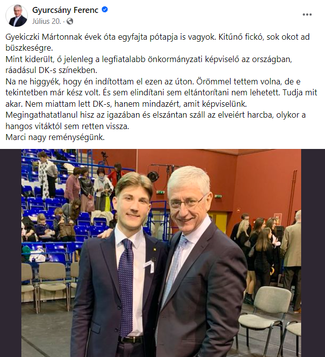 Gyurcsány Ferenc pártelnök július 20-án így írt róla:„Gyekiczki Mártonnak évek óta egyfajta pótapja is vagyok. Kitűnő fickó, sok okot ad büszkeségre. Mint kiderült, ő jelenleg a legfiatalabb önkormányzati képviselő az országban, ráadásul DK-s színekben. Na ne higgyék, hogy én indítottam el ezen az úton. Örömmel tettem volna, de e tekintetben már kész volt. És sem elindítani sem eltántorítani nem lehetett. Tudja mit akar. Nem miattam lett DK-s, hanem mindazért, amit képviselünk. Megingathatatlanul hisz az igazában és elszántan száll az elveiért harcba, olykor a hangos vitáktól sem retten vissza. Marci nagy reménységünk.”