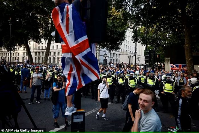 A rohamrendőröket Manchesterben üvegpalackokkal dobálták meg, miután a tüntetők egy Holiday Inn szállodát vettek célba, ahol vélhetően migránsokat szállásoltak el.