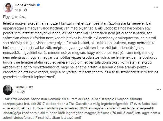„Csak érdeklődöm. Szoboszlai Dominik aki a Premier League-ben szereplő Liverpool támadó középpályása lett, akit 2017 októberében a The Guardian a világ legtehetségesebb 17 éves futballistái közé sorolt, akit az Európai Labdarúgó-szövetség 2020 januárjában a világ ötven legtehetségesebb labdarúgója közé sorolt, aki minden idők legdrágább magyar játékosa ( 70 millió euró) lett, ugye nem a sokmilliárdos felcsuti Pincsi-iskolában lett azzá ami?