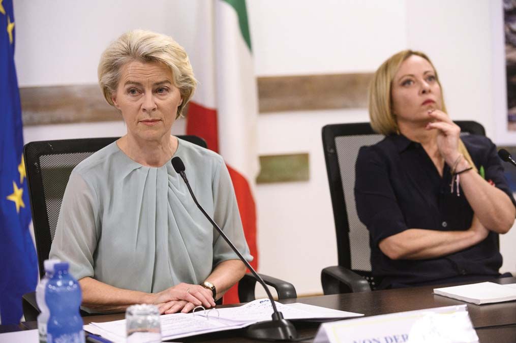 Az Európai Unió vezetői hamar reagáltak az olaszországi eseményekre, igaz, többnyire inkább szavakkal, mint tettekkel. Ursula von der Leyen, az Európai Bizottság elnöke Giorgia Meloni olasz kormányfő kíséretében szeptember 17-én Lampedusára utazott, hogy felmérje a helyzetet, és az EU támogatásáról biztosítsa a helyieket. A két politikus ellátogatott a migráció legfontosabb helyszíneire, a Molo Favaloro kikötőhöz, a hajótemetőbe és a fogadóállomásra is. Délután a közös sajtótájékoztatón Meloni megköszönte Von der Leyennek, hogy azonnal elfogadta a meghívást, együttműködést kért az uniós intézményektől, de hangsúlyozta, hogy az EU részéről ez nem szolidaritás Olaszország iránt, hanem felelősségteljes cselekedet saját magával szemben, hiszen a migráció nemcsak az olaszok, hanem egész Európa gondja. Megjegyezte azt is, hogy Lampedusa nemcsak Olaszország, de egész Európa határa, amelynek megvédése közös feladat.