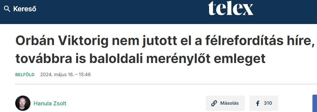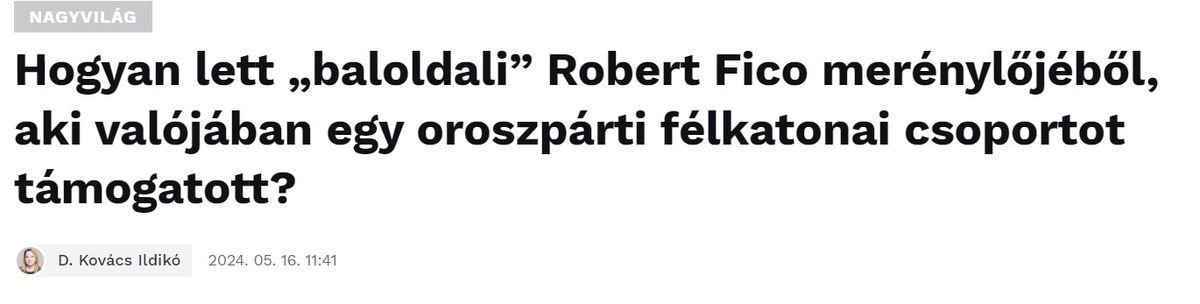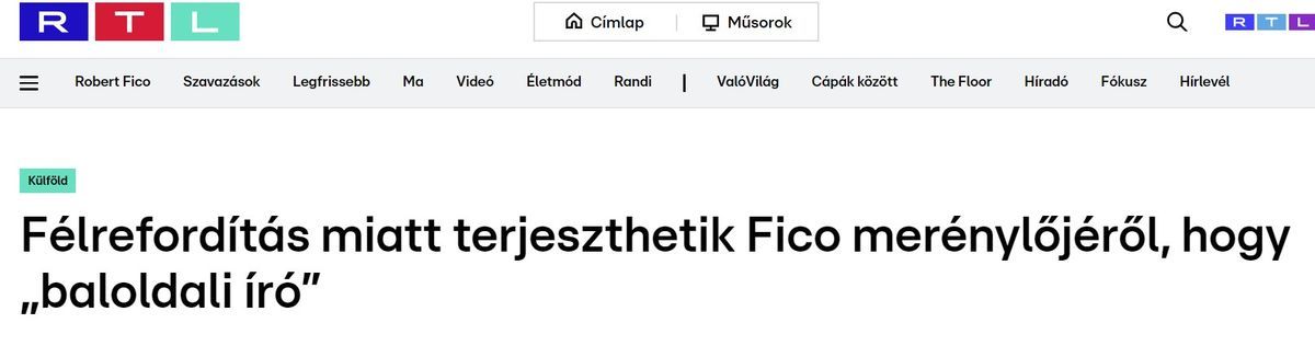A Robert Fico szlovák kormányfő elleni merényletet követően szinte órákon belül elindult a dollárbaloldali sajtóban az új narratívagyártás. Ennek fő mondanivalója, hogy a merénylő a szélsőjobboldali-náci világhoz tartozott. Ezzel szemben a merénylő a progresszív szlovák ellenzék narratívájára hivatkozva követte el tettét, a szintén progresszív Caputová (a szlovák Momentumként is emlegetett párt politikusa) támogatója volt 2019 óta; Ukrajna felfegyverzését pártolta, részt vett a szlovák progresszív ellenzék által szervezett több kormányellenes tüntetésen, ahol „Éljen Ukrajna!” felkiáltással is tüntetett, és azt követően határozta el magát a merénylet mellett, hogy a progresszívok elnökjelöltje, Ivan Korcok alulmaradt az államfőválasztáson.