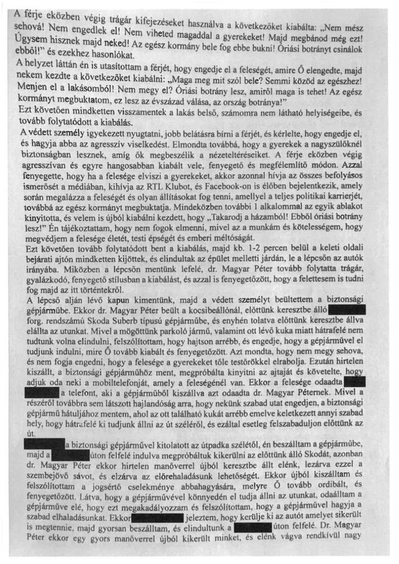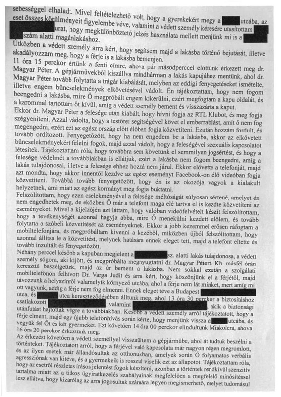 Varga Judit a jegyzőkönyv szerint kérlelte, hogy engedje el, szabad mozgásában ne korlátozza, miközben mindvégig igyekezett nyugtatni, jobb belátásra bírni. Amikor Varga Judit távozni próbált, ahogy a jegyzőkönyv rögzíti, Magyar Péter „folytatta trágár, gyalázkodó, fenyegető stílusban a kiabálást”, és akadályozni próbálta felesége távozását.