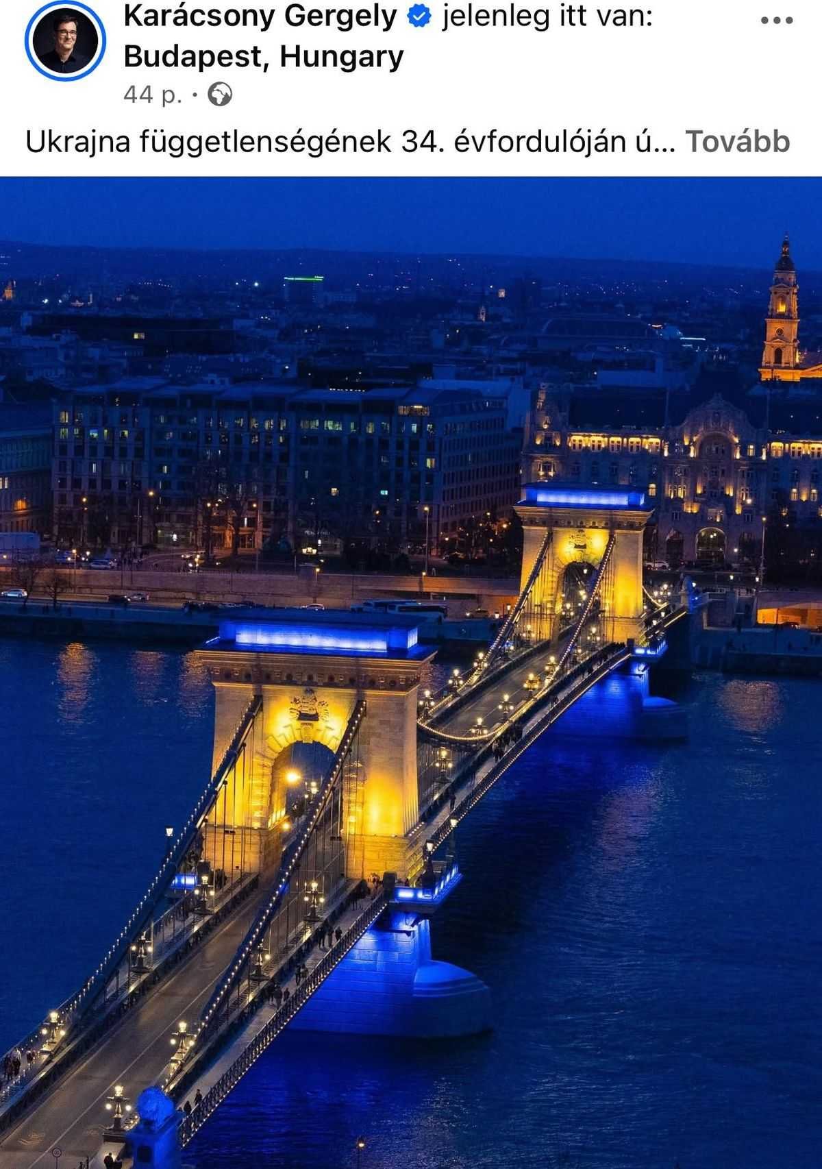„Ukrajna függetlenségének 34. évfordulóján újra ukrán nemzeti színekben a Lánchíd. Mert Ukrajna függetlensége mellett kiállni egyszerre erkölcsi kötelességünk és elemi nemzeti érdekünk” – fogalmazott Karácsony Gergely főpolgármester egy bejegyzésben, melyet a közösségi oldalán tett közzé. A többhetes nyári álmából lassan talán már felébredő városvezető a poszthoz mellékelt egy fotót, amelyen az ukrán színekre fénnyel festett Lánchidat mutatja, majd egy kommentben hozzátette: a fotó 2024 februárjában, a háború évfordulóján készült. Megnéztük, és ma is ugyanígy van megvilágítva a Lánchíd.