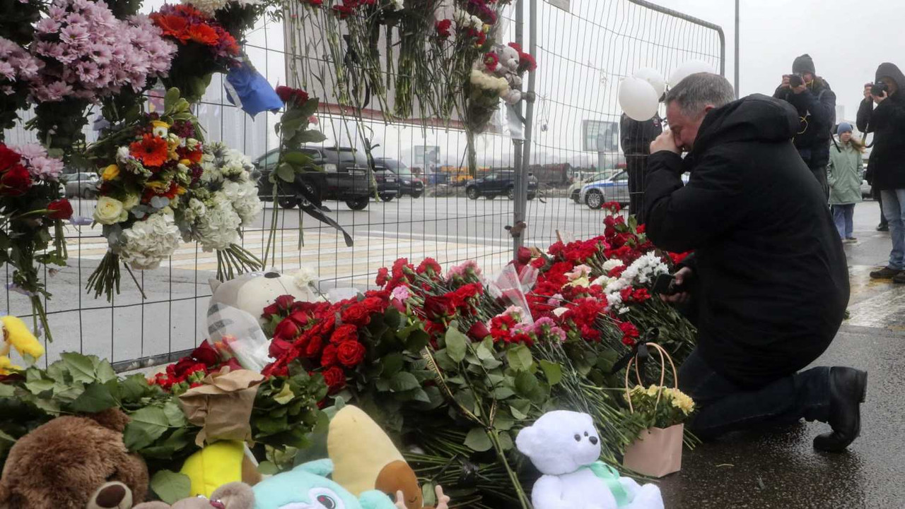 Krasznogorszk, 2024. március 23. Virágcsokrot helyez el egy férfi a Crocus City Hall nevû hangversenyteremnek otthont adó épület közelében rögtönzött emlékhelyen Krasznogorszkban 2024. március 23-án. Előző nap a kulturális központban terrortámadást hajtottak végre, amelynek az orosz Nyomozó Bizottság (SZK) tájékoztatása szerint legkevesebb 115 halálos és több mint száz sebesült áldozata van. (Fotó: MTI/EPA/Makszim Sipenkov)