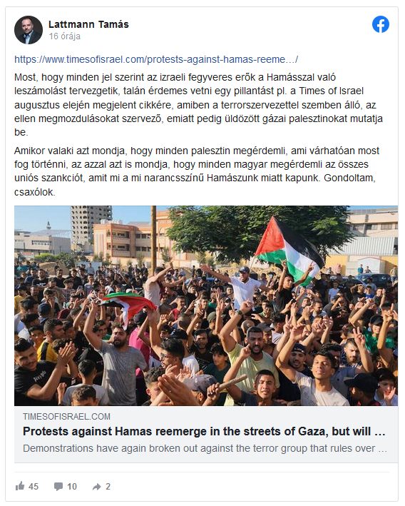 Szóval, ez a „nagyon okos ember” előszedett egy Gianluca Pacchiani nevű újságíró által jegyzett cikket a The Times Of Israel nevű portálról, majd ráhúzta azt lényegében a Fideszre, mely úgy ténykedik az EU-ban, mint a Hamász Izraellel szemben. Vagyis a magyar kormányt ez a szerencsétlen Lattmann terrorizmussal vádolta meg. Na, ugye, én is tudok összefüggéseket találni (kreálni), hiszen a jogászkánk ezt nem írta le, de engedtessék meg nekem, hogy én ezt így értékeljem.