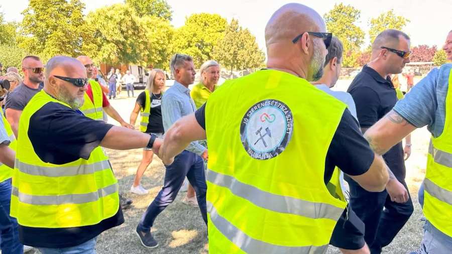 Hozzátette, hogy a több tucatnyi biztonsági ember háta mögül, a sebtében felállított színpad magasságából másfél órán át tűrnie kellett provokációit, és újabb rágalmait, amelyet a magasból mondott – megjegyezve, hogy azért csúszott fél órát a rendezvény, mert gyorsan egy kicsi színpadot dobtak össze neki, amikor meglátták, hogy ott várja Toroczkai László a mikrofon mellett.