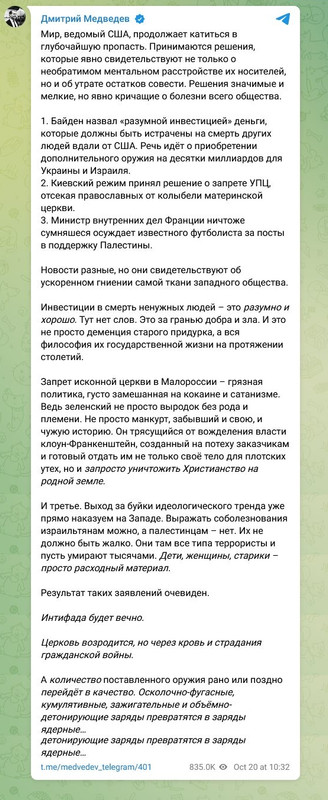 Dmitrij Medvegyev az orosz Biztonsági Tanács elnökhelyettese ma a Telegramon közzétett bejegyzésében élesen bírálta az Egyesült Államokat Izraelt és Ukrajnát támogató felelőtlen politikája miatt. Medvegyev az utóbbi napok eseményei közül csupán hármat emelt ki, melyek már önmagukban is azt mutatják, hogy a Nyugat, élén az USA-val éppen milyen mély szakadékba taszítja az egész világot.