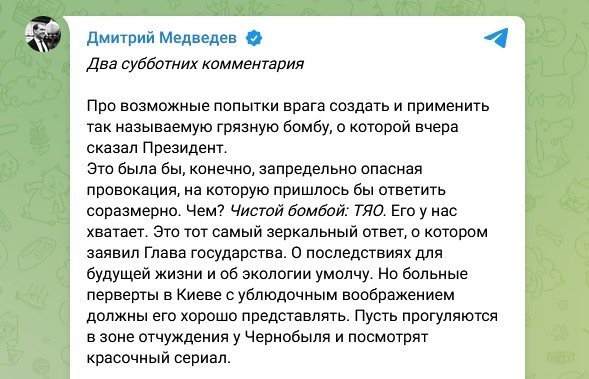 Az ukrajnai konfliktus során Medvegyev többször is felvetette a piszkos bombák témáját, mondván, hogy az ukrán hatóságok végül ilyen eszközhöz is folyamodhatnak. A piszkos bomba egy primitív eszköz, amely hagyományos robbanóanyagokat és nukleáris anyagokat kombinál, és célja nem a robbanás által okozott közvetlen pusztítás, hanem a célterület súlyos szennyezése és besugárzása.