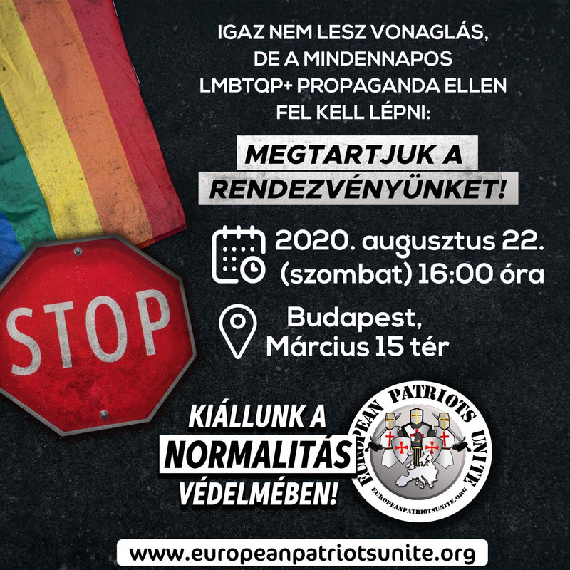 Az LMBTQP+ mindennapossá vált propagandája ellen rendezvényének megtartásával lép fel a European Patriots Unite Egyesület.