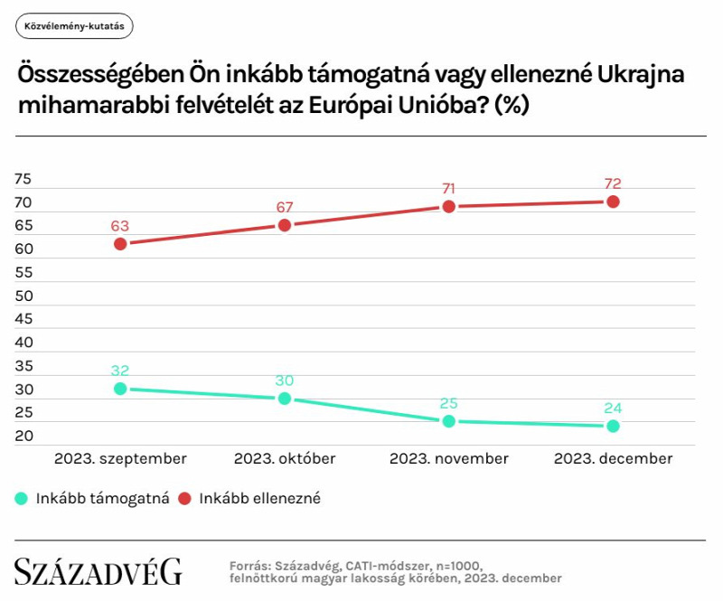A magyarok 62 százaléka nem támogatja Ukrajna EU-csatlakozását – ez pedig már a Nézőpont Intézet novemberi közvélemény-kutatásából derült ki. A most induló nemzeti konzultáció témái között is szereplő kérdésben még a baloldaliak 44 százaléka és a budapestiek 54 százaléka is elutasító véleményen van.