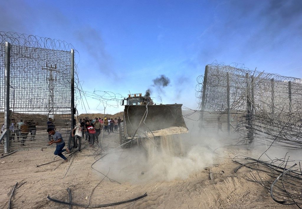 Palesztinok áttörnek egy kerítésen. Anadolu Agency via AFP