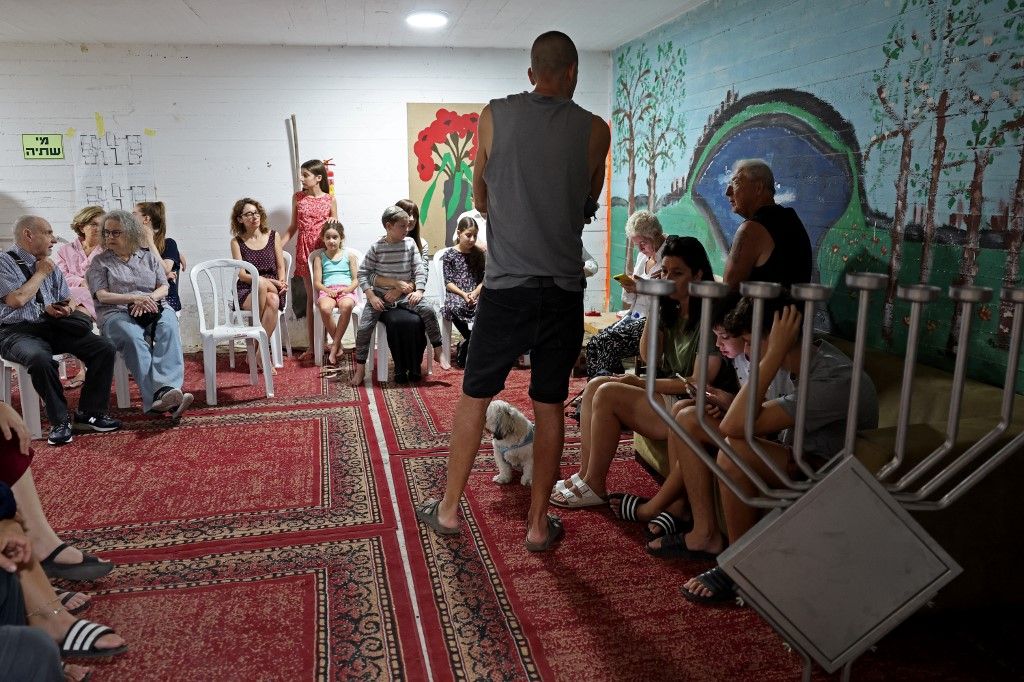 Izraeliek egy Tel-Aviv-i pincében bújnak el a rakéták elől (Photo by JACK GUEZ / AFP)