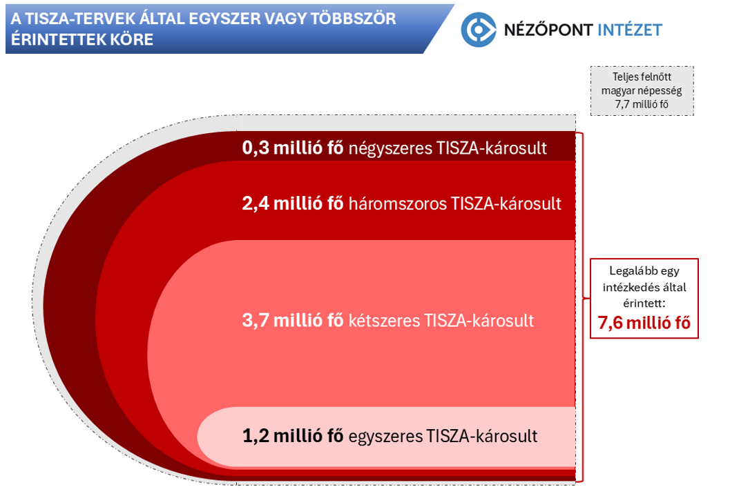 Mintegy 7,6 millió magyart, akár minden háztartást és családot sújthatnának a Tisza Pártnak tulajdonított megszorító tervek. A rezsicsökkentés megszüntetése a legnagyobb mértékben 5,9 millió főt, a kutya- és macskaadó 4,6 millió magyart, a többkulcsos adóemelés akár 2,9 millió keresőt, a 13. és 14. havi nyugdíj eltörlése 2,5 millió nyugdíjast, az szja-mentesség megszüntetése akár 800 ezer édesanyát, a családi adókedvezmény progresszív csökkentése közel 200 ezer főt érinthet. Mintegy 1,2 millió magyart sújtana legalább egy intézkedés, közel 3,7 millióan pedig kétszeres, 2,4 millió magyar pedig háromszoros károsult lenne az őket érintő intézkedések számát tekintve.