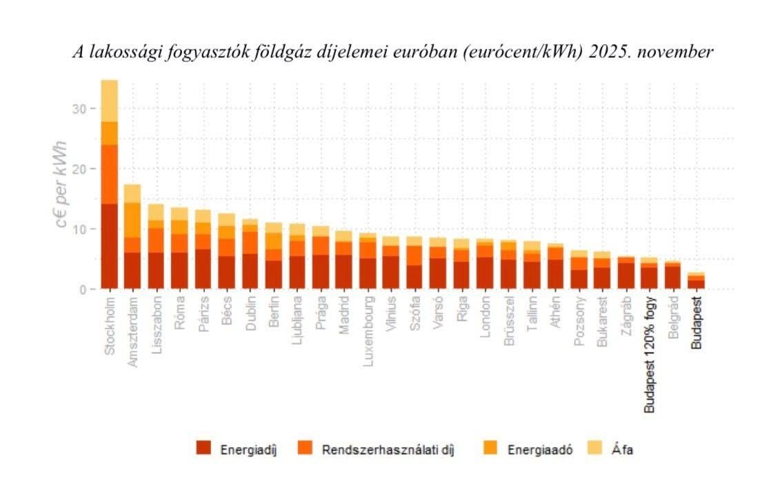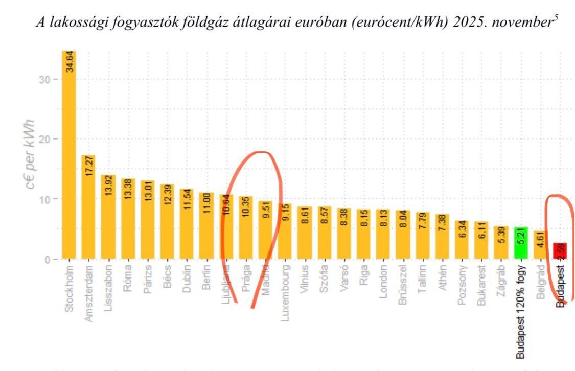 A szakértő három ábrával támasztotta alá állítását: a gáz ára Magyarországon – rendszerhasználattal, adókkal együtt – mindössze 2,6 eurócent, míg Prágában 10 eurócent. Az áram esetében még látványosabb a különbség: nálunk 9,5 eurócent, Csehországban 35 eurócent.