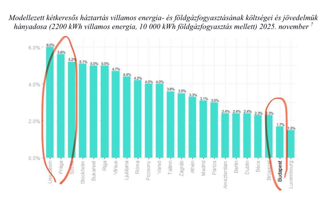 Egy modellezett kétkeresős magyar háztartás a jövedelmének csupán 1,7 százalékát költi gáz- és villanyszámlára, míg a cseh megfelelője 5,6 százalékát – ez több mint háromszoros különbség.