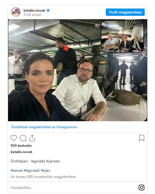 Novák Katalint Kijevbe érkezése után azonnal óvóhelyre szállították egy légiriadó miatt. Erről saját