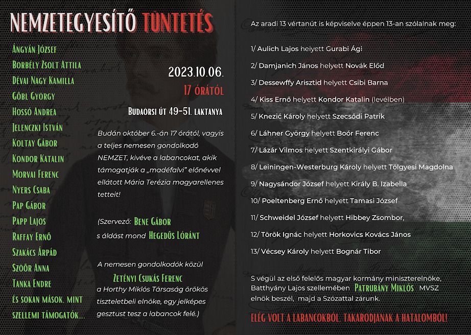 Gábor! Szégelljétek magatokat és nyugodt lélekkel csatlakozzatok – immár nyilvánosan – is Gyurcsányékhoz. Mert semmiben sem különböztök attól az ellenzéktől, amely nap-nap után a magyarság jövője ellen áskálódik! Nem kötelező szeretni a Habsburgokat vagy Orbán Viktort, de az igazi gyalázat, amit az aradi vértanúk gyásznapján műveltek, mert az aradi vértanúk napján művelitek! Ezzel a súlyos, nemzeti érzéseket sértő zavarkeltéssel, a magyar függetlenségért, a magyar összetartásért életüket adó vértanúk sem értenének egyet. Gróf Batthyány sem!