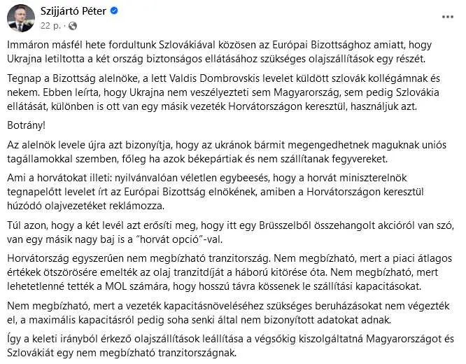 A tárcavezető bejegyzésében felidézte, hogy másfél hete fordultunk Szlovákiával közösen az Európai Bizottsághoz amiatt, hogy Ukrajna letiltotta a két ország biztonságos ellátásához szükséges olajszállítások egy részét.