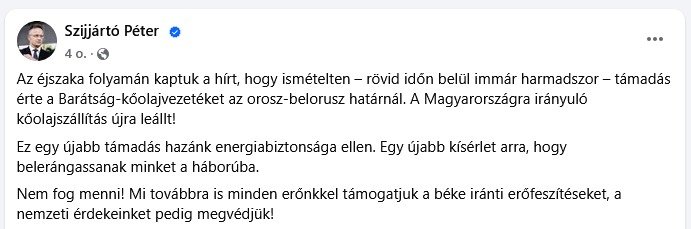 Az éjszaka folyamán kaptuk a hírt, hogy ismételten – rövid időn belül immár harmadszor – támadás érte a Barátság-kőolajvezetéket az orosz–belorusz határnál. A Magyarországra irányuló kőolajszállítás újra leállt – közölte Szijjártó Péter külgazdasági és külügyminiszter pénteken a Facebookon.