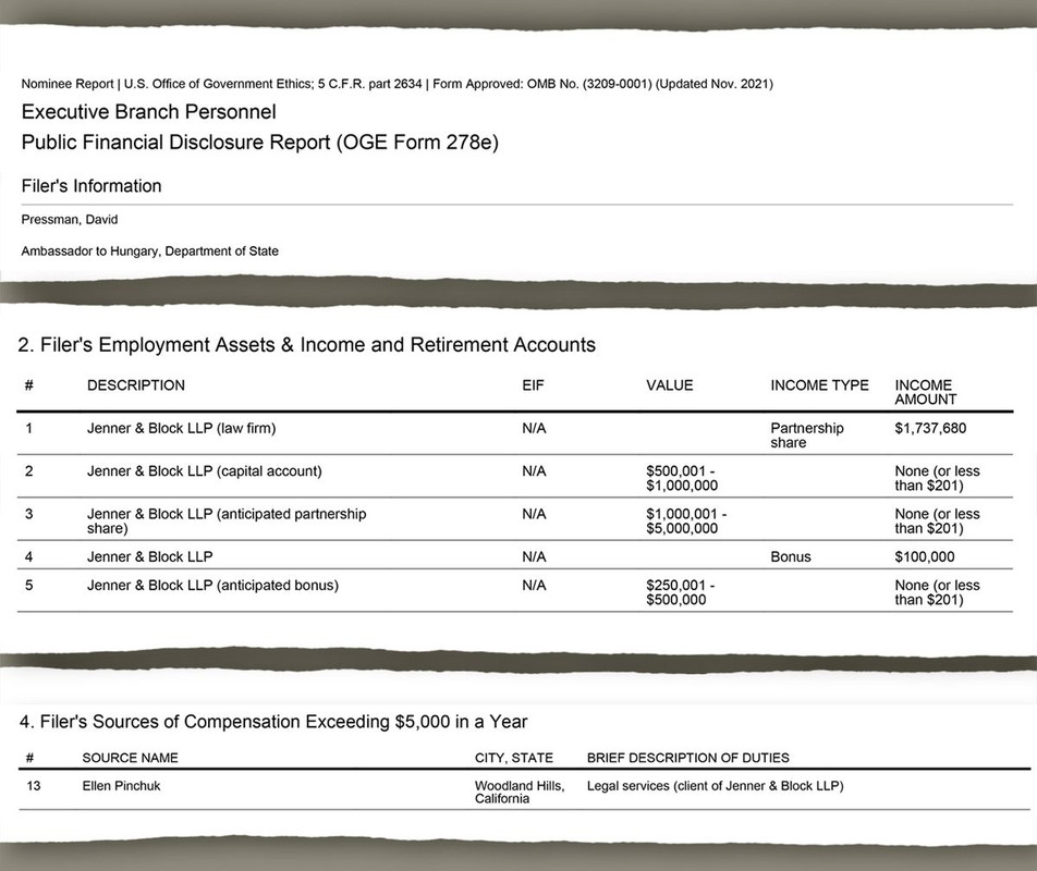 Pressman budapesti nagyköveti kinevezése kapcsán napvilágot látott egy nyilvános pénzügyi nyilatkozat, melyben fel kellett tüntetnie, hogy a kinevezését megelőző években milyen anyagi forrásokkal rendelkezett. Ebben szerepel egy bizonyos Ellen Pinchuk, lakcíme Woodland Hills, Kalifornia, akitől több mint 5000 dollár bevétele származott jogi tanácsadás címen, s aki a Jenner & Block ügyfele volt. Tehát 2020 és 2022 között.