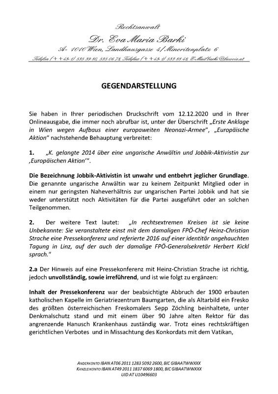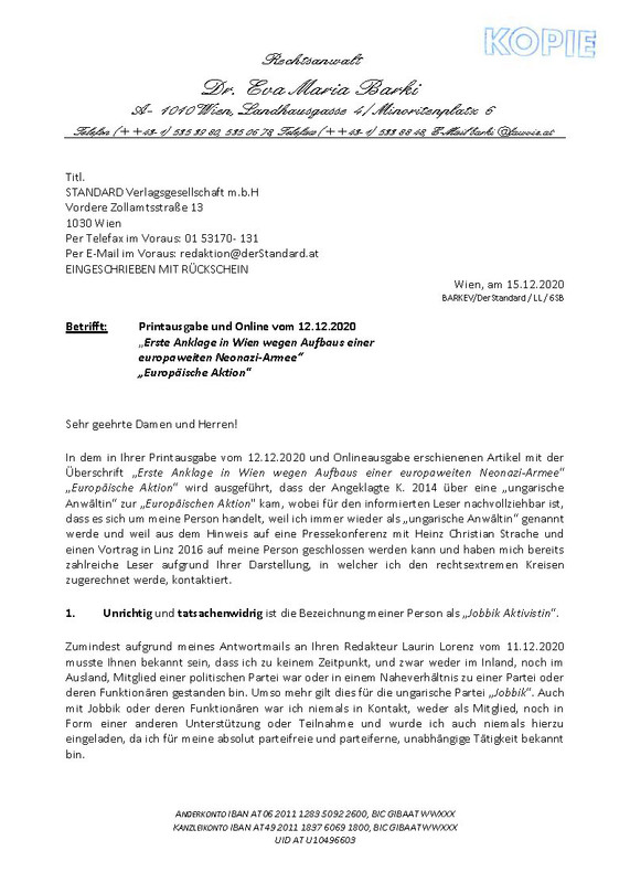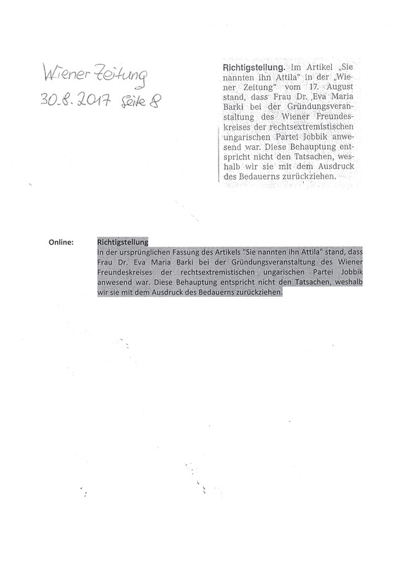 Már évekkel ezelőtt a Wiener Zeitung a tényekkel ellentétben számolt be arról, hogy részt vettem a Jobbik Bécsi Baráti Körének alapító gyűlésén. Nem voltam ott és nem is volt tudomásom erről, nem kaptam meghívót sem. Az álhírt a Wiener Zeitungnak vissza kellett vonnia, lásd a mellékletet.