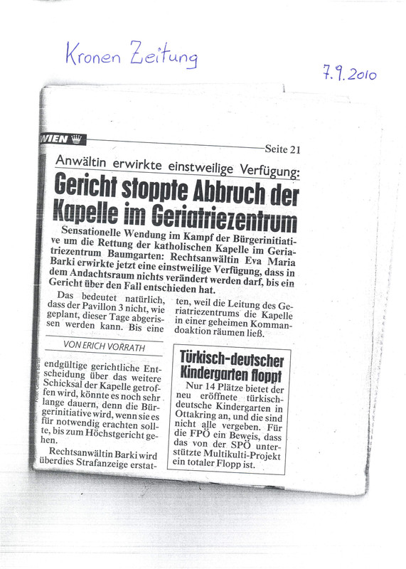 Ennek a sajtókonferenciának tárgya a bécsi Geriatriezentrum Baumgartenben az a katolikus kápolna volt, amelyet le akartak bontani, jóllehet műemlékvédelem alatt állt, az oltárkép a legjelentősebb osztrák freskófestő, Sepp Zöchling műve volt. Az általam elért jogerős bírósági tilalom és egy prominens bizottság appellációja ellenére a vörös Bécs ragaszkodott a lebontáshoz. (A kápolna több mint 90 éves rektor, a mellette lévő kórház illetékes papja, el kellet hagynia a lakását és vissza kellett térnie a szülőföldjére, Szlovéniába)