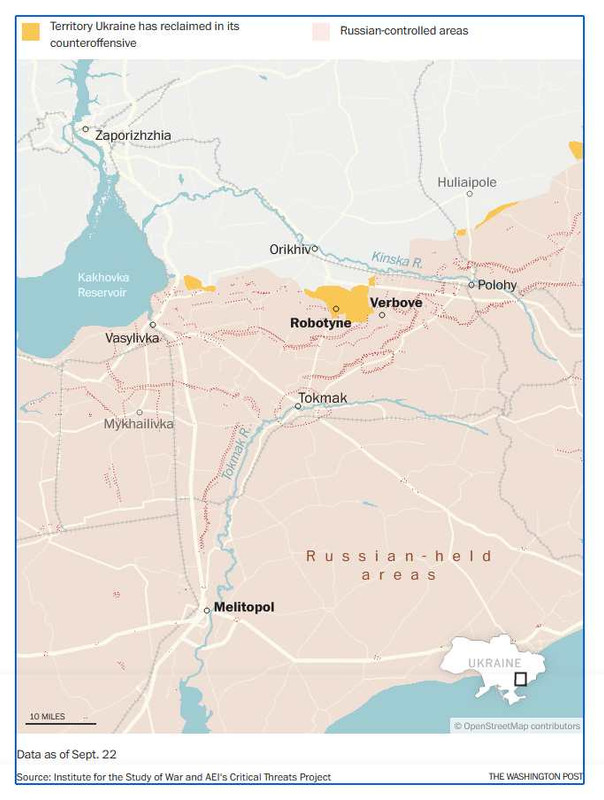 Az újságnak adott interjúban egy meg nem nevezett ukrán légvédelmi egység parancsnoka azt állította, hogy Kijev némi területet szerzett a zaporozsjei területen, Robotino és Verbovoje települések közelében, amelyek az elmúlt hetekben heves harcok színhelyei voltak, bár elismerte, hogy az előrenyomulás igencsak „szerény”.