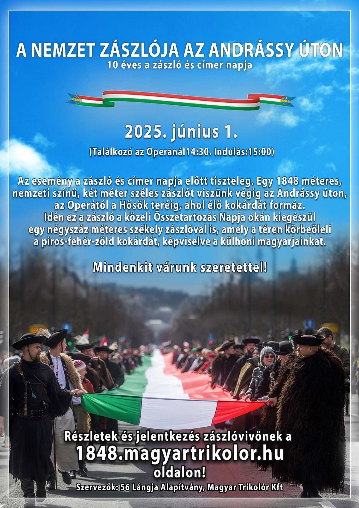 Idén ünnepeljük a magyar zászló és címer napjának tizedik évfordulóját. Az ünnepnapot Szilágyi Ákos kezdeményezésének eredményeként Wittner Mária, Németh Szilárd és Rogán Antal támogatásával 2014. december 17-én foglalta országgyűlési határozatba a magyar parlament. 2018 óta láthatjuk évente Budapesten vonulni az 1848 méter hosszú zászlót, amely a közeli Összetartozás Napja tiszteletére kiegészül egy négyszáz méteres székely zászlóval is. Az idei esemény háziasszonya Timkó Eszter, Jászai Mari díjas művésznő lesz. Az indulásnál a zászlóanya, Bánffy Szilvia Ildikó és Ábrahám Róbert publicista köszönti az egybegyűlteket. A terén Kovács Nóri énekes, Schauer Viktor László, Digitális Tartalomkészítő, István Dániel Youtuber és jeles hazai művészek és közéleti személyiségek köszöntik a zászlóval érkezőket.