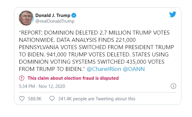 Az elnök szerint országosan a Dominion 2,7 millió leadott szavazatot törölt a neve mellől. Az elemzések szerint 221 ezer Pennsylvániában Trumpra leadott szavazat került Bidenhez és 941 ezer egyszerűen eltűnt- derül ki Donald Trump twitter bejegyzéséből. Az elnök továbbá azt is állította, hogy azok az államok, ahol ezt a rendszert használták 435 ezer szavazatot vettek el tőle és irányították át Bidenhez.